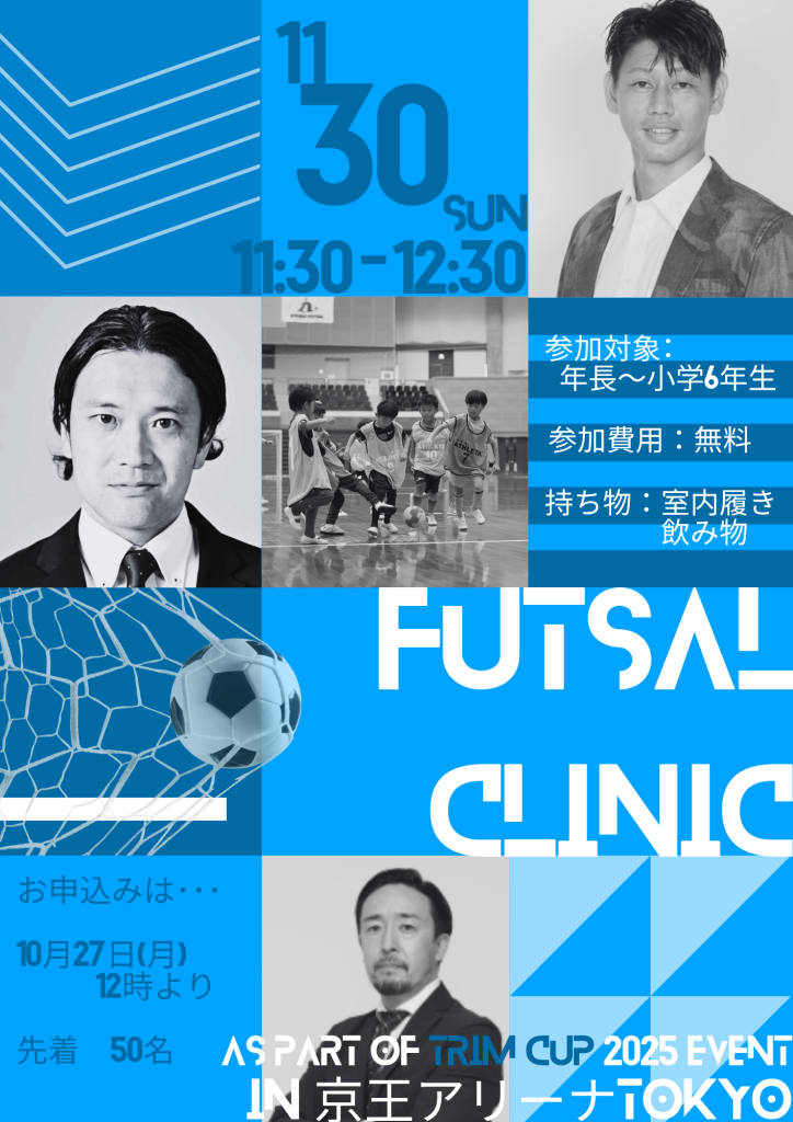 11月30日(日)東京都調布市「京王アリーナTOKYO」にて開催される日本トリム Presents 第17回全国女子選抜フットサル大会の会場で、アスリート委員会によるフットサルクリニックを実施いたします!