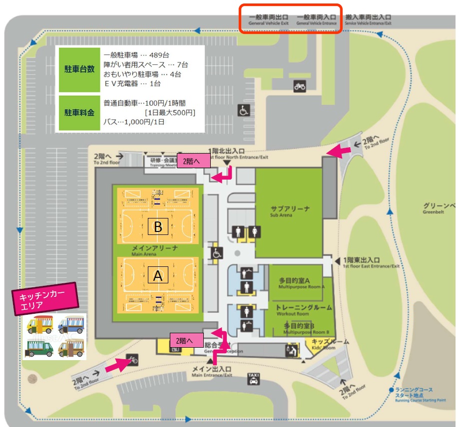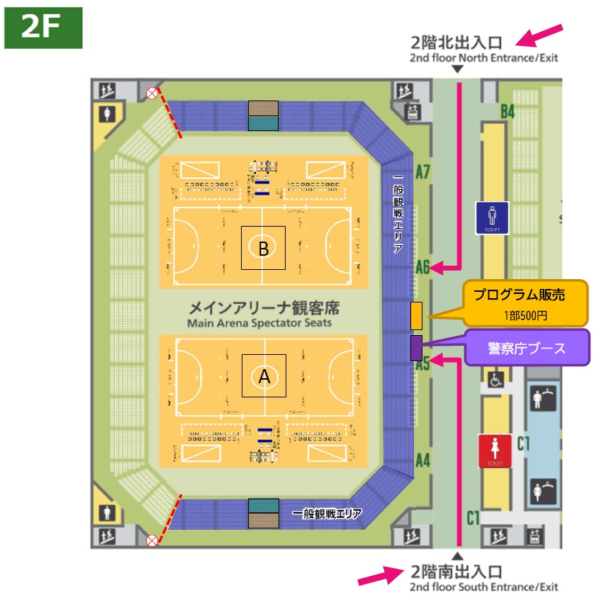 ※会場外階段を上がっていただき、2階観戦席入口よりアリーナへお入りください。