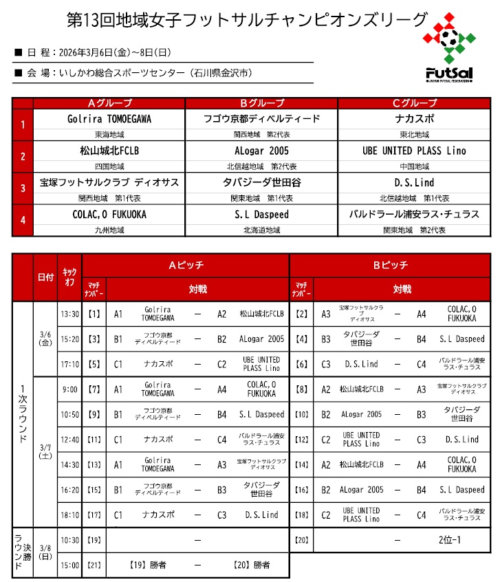 第13回地域女子フットサルチャンピオンズリーグを2026年3月6日(金)~8日(日)の3日間、石川県金沢市のいしかわ総合スポーツセンターにて開催いたします。